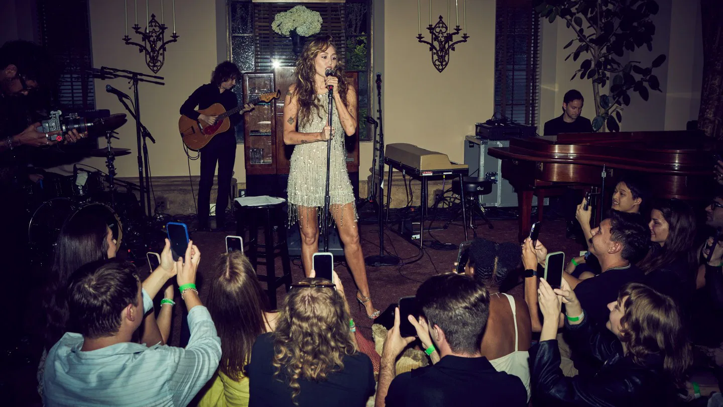 While mainly consisting of devoted fans, the crowd also featured a few friends, including Anya Taylor-Joy. Guests began arriving at the Chateau at 6 p.m., expecting just a sneak peek of the album before its official release this Friday. By 7 p.m., the lively chatter in the room briefly quieted as everyone anticipated what would happen next, only to erupt once more in cheers when Cyrus stepped up front with her band.