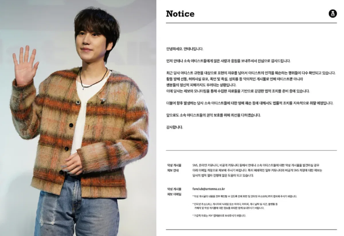 On June 4th, Antenna stated, “We have recently identified multiple instances where comments have exceeded the boundaries of free speech, significantly damaging our artist Kyuhyun’s personal dignity. Malicious posts that include attempts to disrupt his activities, dissemination of false information, offensive language, and sexual harassment have caused distress not only to the artist but also to his fans’ mental well-being. Armed with evidence from monitoring and reports, we are preparing strong legal measures.”